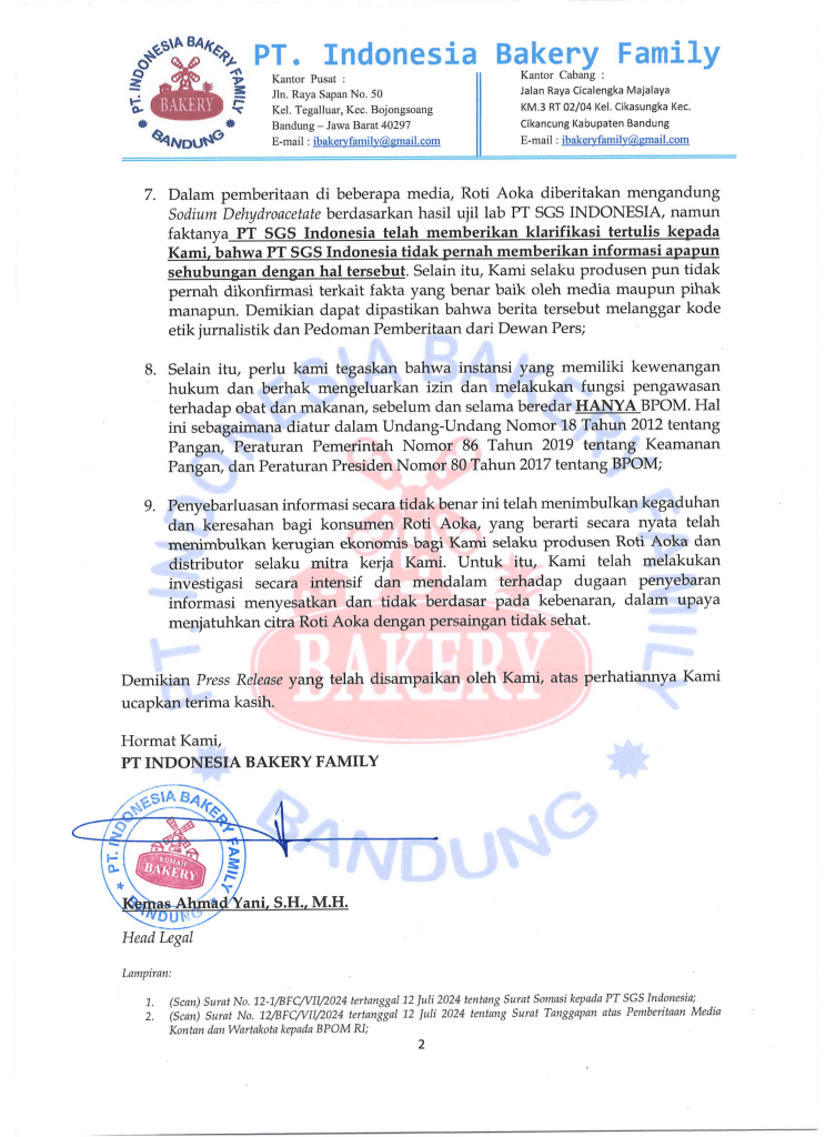 Produsen roti Aoka PT IBF menanggapi informasi yang viral di media sosial saat ini. Perusahaan itu menugaskan tim kuasa hukum untuk memimpin komunikasi perusahaan dalam kasus ini.
